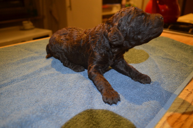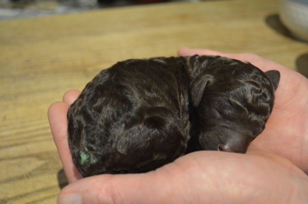 Wunderschön, so ein neugeborenes Hundekind! Die kleine Quiana paßt leicht in zwei Hände! Die kleinen Wellen im Fell sagen uns: Ein Pudelkind!