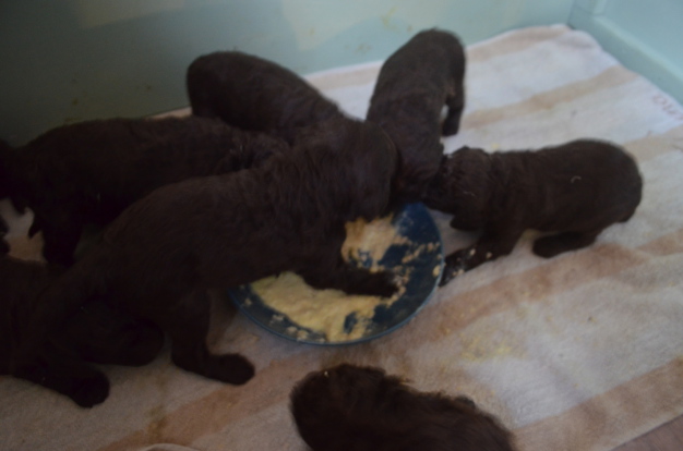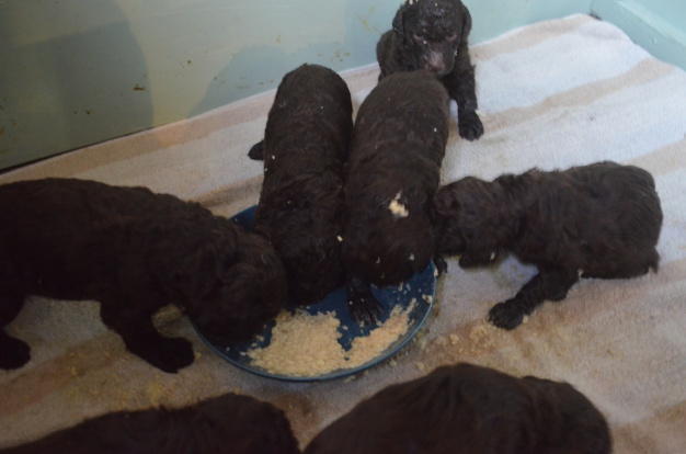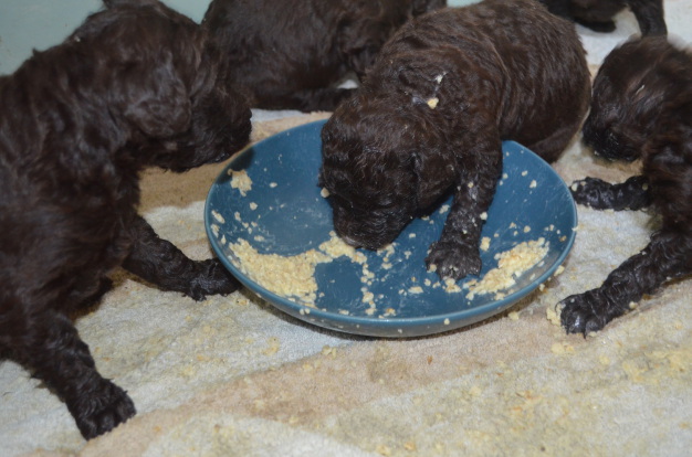 Unsere Pudelkinder sind in den letzten zwei Tagen wieder ein ganzes Stück gewachsen, alle haben sehr gut an Gewicht zugenommen, und trotzdem konnten wir nach den letzten Milchmahlzeiten von Mutter Belle eine zunehmende Unruhe im Wurf sehen. Gerade die kleineren der Welpen bekommen nun nicht mehr die sättigende Milchmenge, während die Größeren ihre Geschwister gern einmal beiseite drängen.
