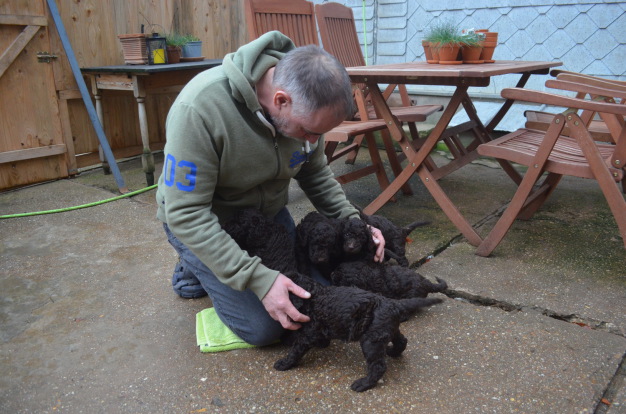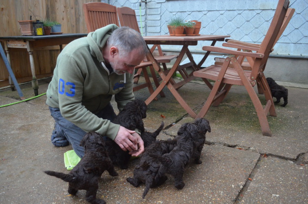 ... so interessant der Auslauf auch ist: Lebensmittelpunkt der Kleinen ist und bleibt der Mensch, der mit so viel liebevollen Streicheleinheiten und duftenden Mahlzeiten sofort aufgeregt begrüßt wird! Alle Welpen kennen uns ganz genau, und auch wir können alle nun gut unterscheiden. Natürlich helfen uns immer noch die Farben des Schwänzchen, mit denen wir die Welpen gekennzeichnet.