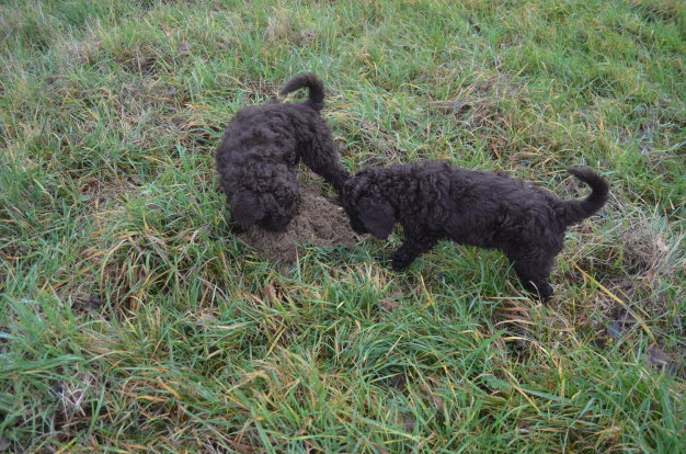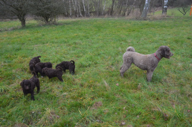 Im neuen Zuhause dagegen beginnen die Welpen sofort mit dem, was sie am Besten können und was das Leben mit einem Großpudel, der ja insgesamt weniger Temperament als z.B. ein Zwergpudel besitzt, so angenehm macht: