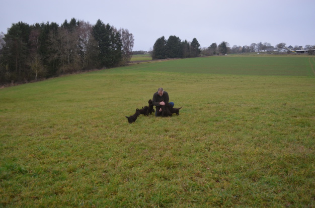 ...spätestens nach der zweiten Runde entpannt sich die kleine Gruppe zusehens... und am vierten Tag wird das Abenteuer richtig schön, denn es geht hinaus in unsere Wiesen! Alle Welpen sind jetzt prima abgehärtet, brauchen zuhause keine Wärmelampe mehr, und haben trotz der tiefen Temperaturen unbändige Freude an diesen Ausflügen. Wir merken, daß wir jetzt dem immer stärkeren Entdeckerdrang der Hundekinder durch neue Reize und Abenteuer auch außerhalb von Haus und Hof entgegenkommen müssen!