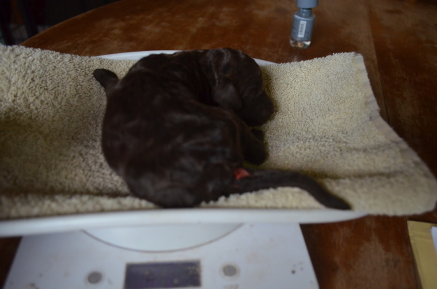 Erinnert Ihr Euch an das unfertige, zwei Tage alte Hundekind auf der Küchenwaage? Hier seht Ihr es noch einmal: