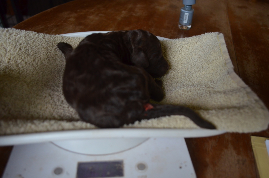 Morgen berichten wir weiter, und es wird neue Bilder geben! Die ersten Tage im Leben eines Hundewelpen sind spannend, und niemals ohne Risiko. Oft nehmen die Hundekinder am ersten Lebenstag an Gewicht ab, denn der Milcheinschuß der Hündin kommt meistens etwas verspätet. So haben uns dann auch die Sorgen gleich wieder fest im Griff, das erste Wiegen nach der individuellen Kennzeichnung der Hundekinder zeigt heute nur bei zwei der Hundekinder eine Gewichtszunahme. Allerdings ist dieses erste Wiegen immer mit einigen Fehlern behaftet, wiegt man doch gleich nach der Geburt ein nasses Welplein, daß in den nächsten Stunden erst vollkommen mit Hilfe der Hundemutter trocknen muß!