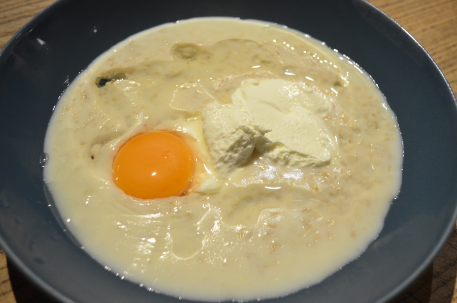Wir verwenden ultrafrische Vorzugsmilch von der Kuh und veredeln mit einem Quantum Öl für den Fettgehalt, einem Quantum Quark für den Eiweißgehalt und rohem Eigelb für die frischen, naturbelassenen Vitamine. In die Milch kommt eine Gabe zarte Haferflocken, die wir mit der Hälfte der Rohmilch aufkochen. So bleiben die Vitalstoffe der Milch unangetastet.