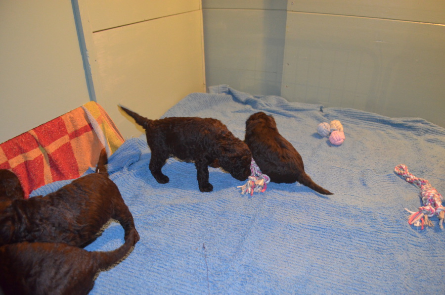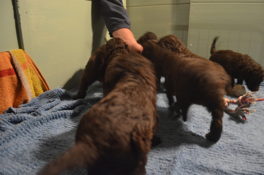Auch die kognitiven Fähigkeiten der Welpen sind jetzt deutlich gereift: Wir werden tatsächlich schon mit wedelnden Schwänzchen begrüßt, wenn wir zu den kleinen braunen Kobolden gehen. Natürlich ist in diesem Alter ganz wichtig, daß jedes Hundekind nun täglich liebevolle Streicheleinheiten und viele, viele sanfte Worte bekommt! Jetzt wird der Grundstein für eine wirklich tiefe Verbundenheit dieser kleinen Geschöpfe mit uns Menschen gelegt.