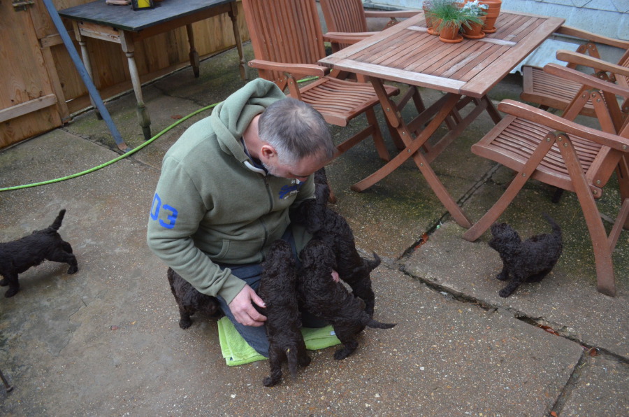 Die Welpen sind wieder gewachsen und wir sahen in den letzten Tagen, daß ihre kleine Welt im Eßzimmer - trotz täglich frisch gewaschener Spielzeuge - nun nicht mehr ausreicht. Jetzt ist die Zeit, die kleinen Schoko-Buddies mit Neuem zu fördern! Wir waren am vergangenen Mittwoch zum ersten Mal in dem kleinen, gesicherten Welpenauslauf hinter der Küchentüre! Es war zwar kalt hier im Hunsrück, aber aus Zucker sind die kleinen Pudelkinder ja nicht! Alle haben freudig mit aufgeregt aufgerichteten Schwänzchen das neue Terrain erkundet! Da gibt es interesante Bodenritzen im Beton... kann man die auslecken? Ja, man kann, aber zu viel Dreck macht Durchfall! Der kleine Organismus ist nun in der Phase der Stabilisierung, und die Welpen müssen sich jetzt an Umweltkeime gewöhnen. In der Regel geschieht dies ganz problemlos. Wir unterstützen den jungen Organismus, indem wir alle Nahrung anwärmen und auch das Wasser überschlagen anbieten. Viele, viele Male muß der Wassernapf geleert und frisch gefüllt werden, denn garantiert fällt nach wenigen Augenblicken einer der Kleinen hinein! Schmutziges Wasser und zu kaltes Futter sind immer ungünstig in der Aufzucht. Ich bitte alle, die sich schon jetzt auf ein Hundekind freuen, den Garten, die Wohnung und die Terrasse zu untersuchen: Blumentopfuntersetzer mit überschüssigem Gießwasser? Nein! Gießkannen, deren Inhalt morgens eine Temperatur knapp über dem Gefrierpunkt hat? Nein! Gebt dann bitte nicht dem Futter die Schuld für die Magenerkältung Eures kleinen neuen Lieblings oder den heftigen Durchfall.