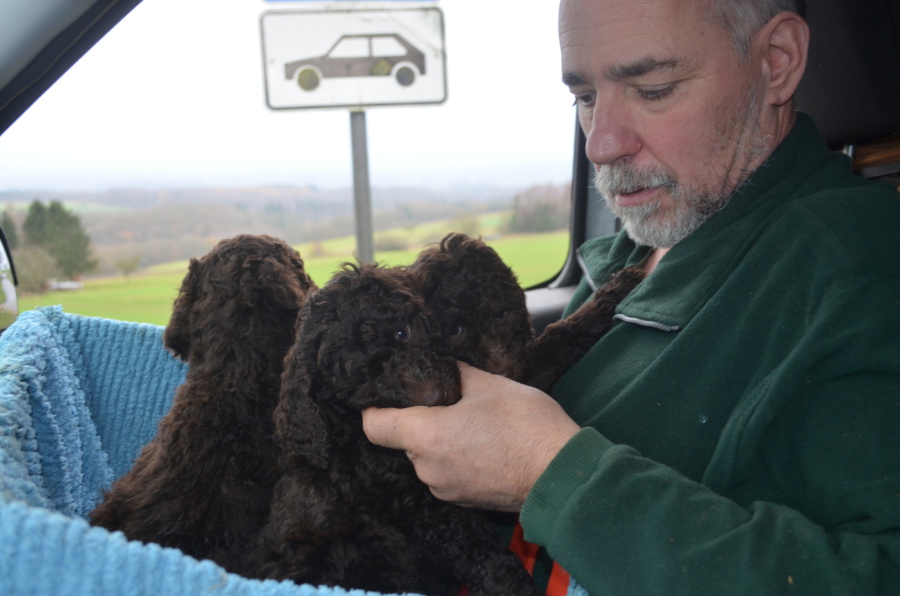 Die ersten Autofahrten haben wir mit gutem Erfolg hinter uns gebracht: Keinem der kleinen Löckchen ist übel geworden, und auch Ängstlichkeit haben wir nicht beobachtet. Mutter Betty war immer dabei und natürlich kennen die Welpen den beruhhigenden Klang unserer Stimmen schon sehr genau. Viel gute Worte verfehlen hier nicht ihre Wirkung! Seht selbst die Bilder der ersten Trainingsfahrten: