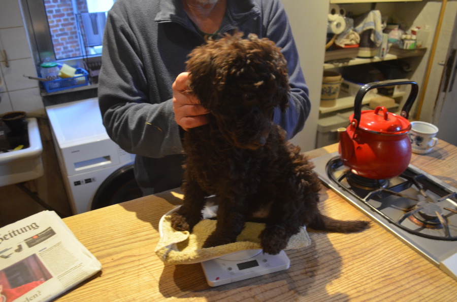 ... unglaublich, was acht Wochen Muttermilch und -viel Liebe doch ausmachen! Die kleine Quita hat, ebenso wie ihre Geschwister, kaum noch Platz auf der Waage. Ein kräftiges Hundekind, das nun bereit ist, seinen neuen Weg zu gehen!
