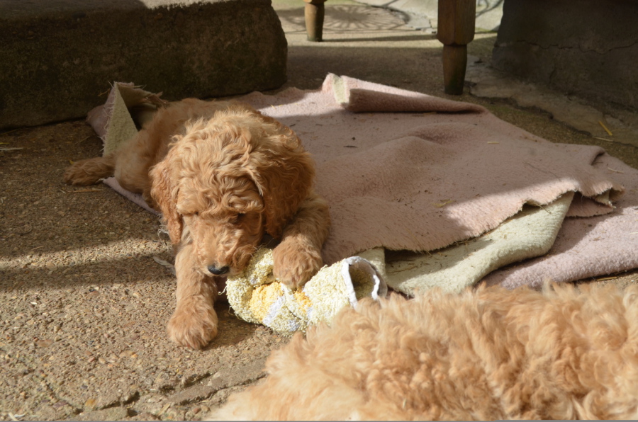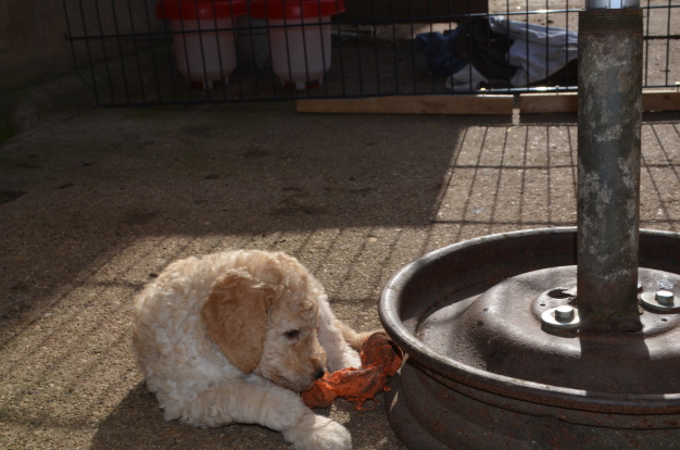 In der Zwischenzeit ist nicht nur der Auslauf für die Welpen interessant, sondern sie beobachten genau auch die Hühner und Enten auf der anderen Seite ihrer kleinen Welt. Da diese keine große Tendenz zur Flucht zeigen, werden sie schnell recht uninteressant. Wir finden diese passive Prägung ganz gut, denn auch die neuen Familien wollen ja keine kleinen Jäger heranziehen. Wie wir schon erklärten, sind im ersten Lebensjahr Bälle absolut tabu, sie fördern den Jagdtrieb, der später nur schwer zu kontrollieren sein könnte. Wir haben daher nicht-rollende Spielzeuge: Ein paar Plüschtiere, ein paar weiche Haselnußhölzer, alle Spieltiere natürlich ohne Quietscher (das Ding das beim draufbeißen so herrliche Geräusche macht), der leider auch den Jagdinstinkt für einen Haus- und Familienhund ungünstig beeinflusst.