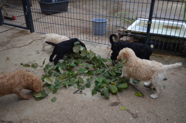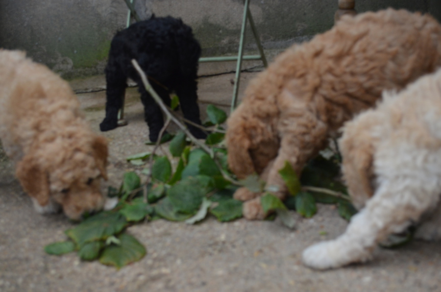 ... an manchen Tagen ist es gar nicht so einfach, die kleine überschäumende Schar zu beschäftigen! Am Vortag haben die Welpen zwei große Pappkartons zerlegt, und sich dabei müde gespielt, und gestern waren es einige weiche Haselnusszweige, die sich herrlich zerbeißen ließen. Die weichen Zweige sind für die Welpen völlig ungefährlich, sie lernen geschickt darüberzuspringen, haben eine neue Struktur in ihrer kleinen Welt und sind für einige Stunden auch mit Mäulchen beschäftigt! Ein zufällig abgeschlucktes Blättchen bleibt gewöhnlich ohne Folgen. Für uns wieder eine Gelegenheit, viel zu beobachten!