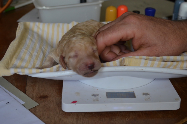 ... wir befinden uns ja schon in der zweiten Lebenswoche der Welpen, und in unserer Wiegeliste halten wir in der ersten Lebenswoche täglich die Gewichte der kleinen Pudelkinder fest. So haben wir jederzeit eine große Sicherheit, daß jeder der Welpen auch wirklich satt wird. Je älter die Welpen werden, desto weniger Risiken gibt es. Wichtig ist in diesem Alter nicht das absolute Gewicht, denn auch ein zum gegenwärtigen Zeitpunkt kleinerer Saugwelpe kann sich später zu einem der größten Junghunde herauswachsen. Viel wichtiger für uns ist die Tageszunahme.