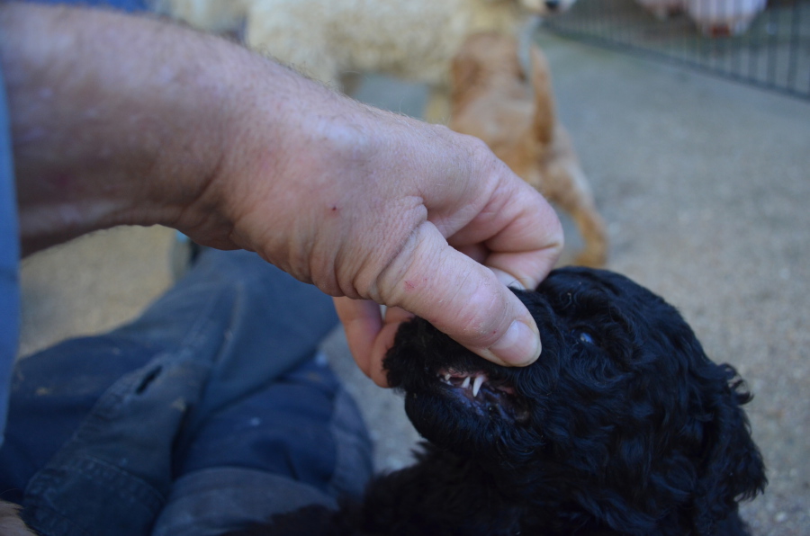 Ein sehr spannender Moment der letzten Tage war die erste Zahnkontrolle! Alle Pudel, die sich fortpflanzen sollen, müssen gute, d.h. ausreichend breite Kiefer aufweisen, damit die Fangzähne (ugs. "Reißzähne", wissenschaftlich "Canini") nicht zu eng stehen. Ein Canini-Engstand kann später Probleme mit sich bringen und so sind wir immer ein wenig aufgeregt, wenn die erste Zahnkontrolle naht! In unserem Fall war die Aufregung umsonst: Alle Pudelchen haben ein tolles Gebiß! Wir danken Papa Mozart, der auch einen schönen breiten Unterkiefer hat, für seine Gene!