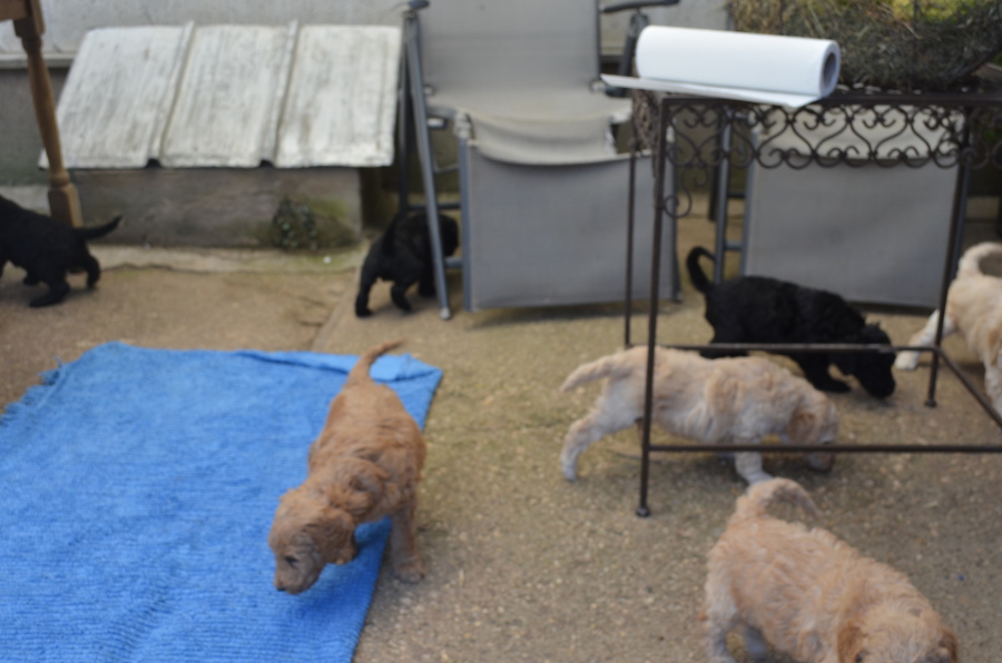 Und auch heute möchten wir von unseren Pudelkindern berichten! Die intensive Zeit der Aufzucht vergeht so schnell, so kommt es uns vor. Dabei haben wir manchmal auch das Gefühl, der Tag müßte mehr Stunden haben! Wir verbringen viel Zeit mit den Welpen, die wieder ein ganzes Stück gewachsen sind. Hatten wir berichtet von der zweiten Wurmkur? Falls nicht, dann jetzt die Information, daß alle Welpen den unangenehmen Saft brav getrunken haben. Zum Glück hatten wir keine Wurminfektion, aber man soll ja auf Nummer sicher gehen.
