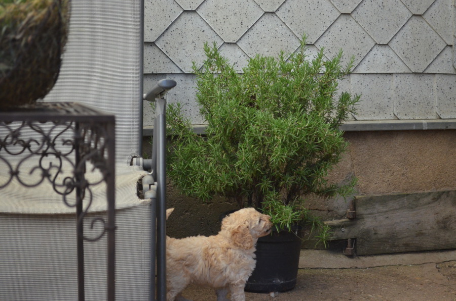 Wir haben im Auslauf alle blühenden Topfpflanzen eine Etage höher gestellt, damit die Kleinen sich daran nicht übernehmen! Aber ein Topf Rosmarin steht nach wie vor am Boden... warum? Wir bemühen uns, den Welpen die Möglichkeit zum "passiven Tadel" einzuräumen, d.h. wir brauchen nicht schimpfen, wenn die Welpen an dem Rosmarin herumbeißen wollen... er schmeckt so schrecklich, daß alle den ersten Versuch schnell aufgeben! So lernen die Welpen früh: Nicht alles auf der Welt ist lecker!