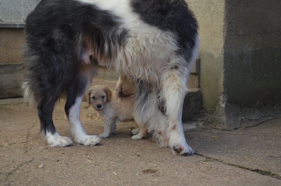 ... mit Mutterhündin Malin macht der Ausflug doppelt Spaß! Sie liebt ihre Kinder sehr und hat nichts dagegen, wenn diese noch kurz versuchen, ein paar Schlückchen Milch zu ergattern... Allein: Die Milch ist längst versiegt, das Gesäuge ist zurückgegangen. So hat Malin sich mittlerweile von der Aufzucht gut erholt. Pudelhündinnen sind in aller Regel liebevolle, sorgende Mütter... Auch für die Hündinnen ist ein Wurf eine tolle Erfahrung im Leben, so meinen wir...