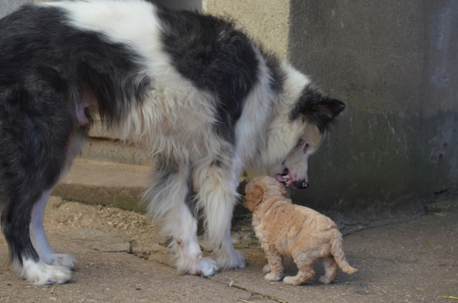 Mutter Malin hat immer weniger Milch, und sie ist wirklich der Meinung, es reicht jetzt mit der Überfürsorge! In wenigen Wochen müssen die Kleinen ohne diese Nahrungsquelle auskommen, und wer sieht, mit welcher Freude sie ihr Fleisch hinunterschlingen, hat keine Zweifel, daß dieses auch klappt! Nahrungstechnisch sind die kleinen Lockenwunder schon jetzt durchaus in der Lage, selbst klar zu kommen. Aber die Psyche der Hundekinder beginnt gerade erst, stabil zu werden. Viele durch uns und das Rudel bzw. die Umwelt provozierte Erfahrungen braucht es, um einen bis zur neunten Lebenswoche selbstbewußten, psychisch robusten Welpen heranzubilden.