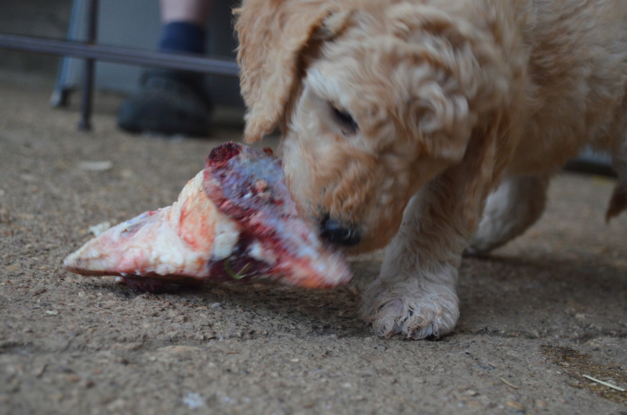 Auch nahrungstechnisch war heute ein toller Tag! die erste richtig schön fleischigen Rinderknochen haben für stundenlange Erregung und helle Freude gesorgt! Wir haben sorgfältig kontrolliert, ob nicht etwa beim Zerkleinern der Knochen spitze Splitter am Fleisch hängen. Wir empfehlen in der ersten Zeit unbedingt, Knochen zu zersägen, roh zu füttern, keinesfalls mit dem Beil zu zerhacken, und die Stücke groß zu wählen. Ganz kleine Stückchen, die mancher aus Vorsicht für geeignet hält, sind dem Welpen nicht zuträglich! Er oder sie würde diese kleinen Knochen im ganzen sofort abschlucken! Die ersten Knochen sollen schon etwa 10-15 cm Länge haben.