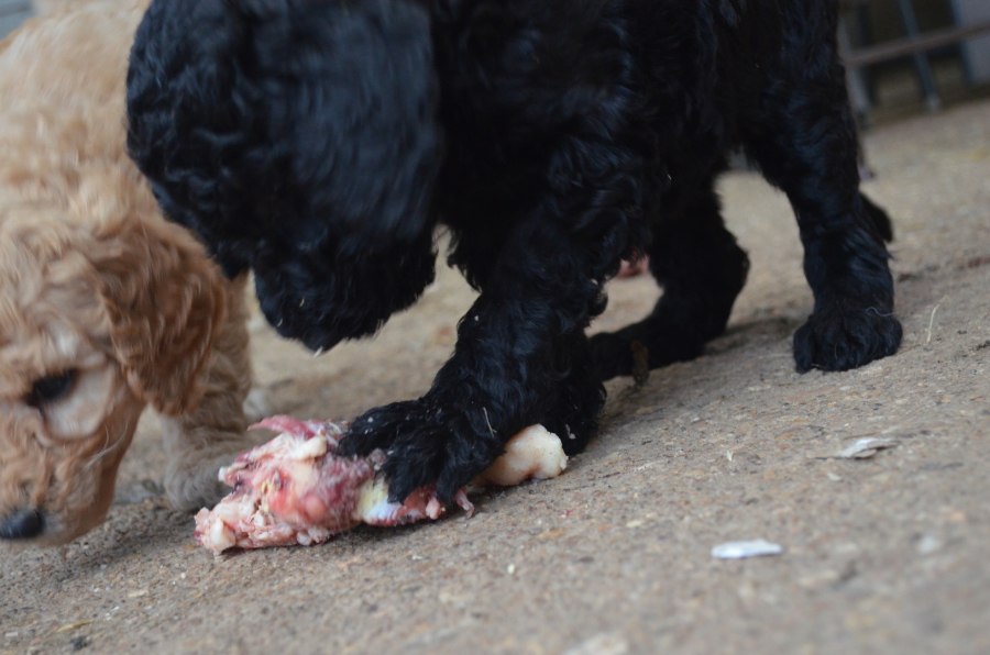 Die Fütterung fleischiger Knochen ist nichtsdestrotrotz eine wichtige Säule der Hundeernährung. Sprecht vielleicht jetzt schon mit Eurem Metger über Unterschenkel vom Schaf (es muß kein Lamm sein!), oder lange Rippen vom Kalb. Toll ist auch Kalbsbrustbein, das darf der Welpe gern mit 60g pro Tag ganz aufessen!